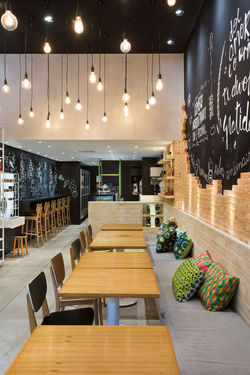 O desafio foi adequar todas as necessidades de cozinha, escritório, estoque e área de café de forma eficaz, funcional e com a menor ocupação possível para então valorizar o espaço de convivência dos consumidores.
